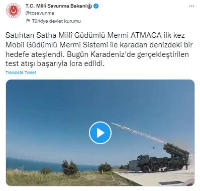 Paylaşımda, "Satıhtan Satha Millî Güdümlü Mermi ATMACA ilk kez Mobil Güdümlü Mermi Sistemi ile karadan denizdeki bir hedefe ateşlendi. Bugün Karadeniz’de gerçekleştirilen test atışı başarıyla icra edildi" denildi.