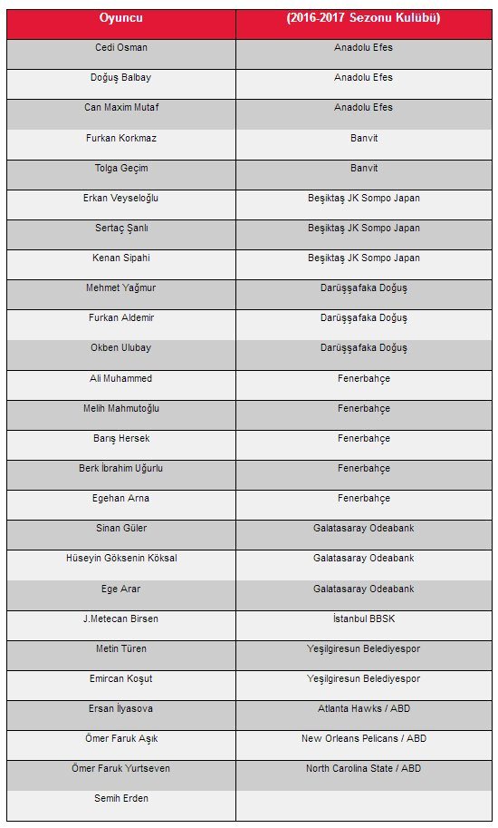 2017 Avrupa Şampiyonasında mücadele edecek olan A Milli Erkek Basketbol Takımımızın aday kadrosu açıklandı.