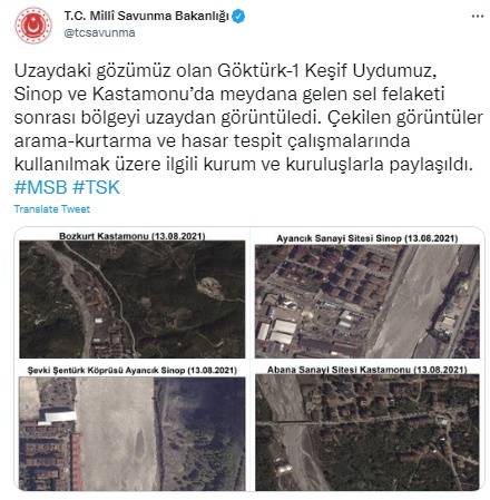 "Uzaydaki gözümüz olan Göktürk-1 Keşif Uydumuz, Sinop ve Kastamonu'da meydana gelen sel felaketi sonrası bölgeyi uzaydan görüntüledi. Çekilen görüntüler arama-kurtarma ve hasar tespit çalışmalarında kullanılmak üzere ilgili kurum ve kuruluşlarla paylaşıldı."