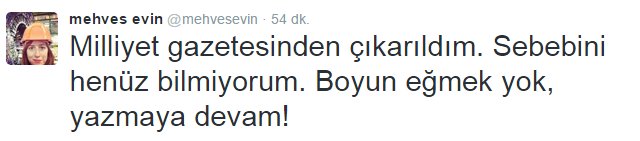 @mehvesevin adlı Twitter hesabından mesaj atan Evin, "Milliyet gazetesinden çıkarıldım. Sebebini henüz bilmiyorum. Boyun eğmek yok, yazmaya devam!" dedi.