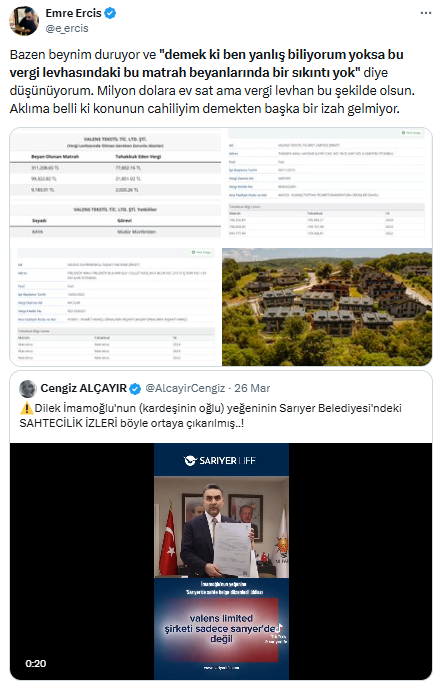 Ekrem İmamoğlu'nun eşi Dilek İmamoğlu'nun kardeşi Ali Kaya'nın oğlu Volkan Kaya'ya ait şirket; sahte belgeyle Sarıyer Belediyesi'ne hiç ödeme yapmadan ödeme yapılmış gibi işlem gerçekleştirdiği yönündeki iddiaya paylaşımda yer veren Erciş şu ifadeleri kullandı: