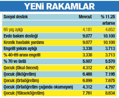 Yüzde 40-69 engeli olanlara ve engelli yakınlarına ödenen aylık 3.338 liradan 3.713 liraya, yüzde 70 ve üzeri engeli olanların aylığı da 5.007 liradan 5. 570 liraya yükselecek.