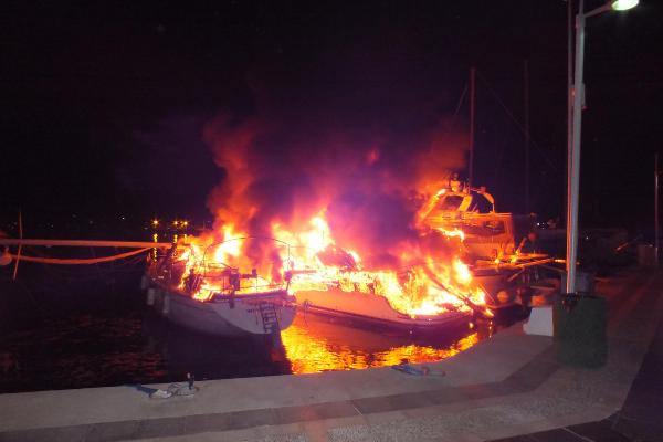 Marmaris'te yabancı bayraklı milyon dolarlık lüks yatların demirli bulunduğu yat limanında bugün saat 04.00 sıralarında bir motor yatta belirlenemeyen nedenle yangın çıktı. Polyester kaplı yatta alevler büyüyerek kısa sürede yanında bulunan bir motor yat ve bir yelkenli tekneye sıçradı. Alevleri gören çevredekiler durumu itfaiye ekiplerine bildirdi. Sevk edilen Muğla Büyükşehir Belediyesi'ne ait 4 itfaiye aracı yangına karadan müdahale etti. Polis, cep telefonuyla görüntü çekmeye çalışanları uzaklaştırarak çevre güvenliğini aldı. Denizden müdahale ekipleri zodyak botlarla yanan yelkenliyi açığa çekerek diğer yatlara sıçramamasını sağladı.
