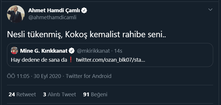 Ahmet Hamdi Çamlı ise, Mine Kırıkkanat’a anladığı dilden cevap verdi. Twitter’da Kırıkkanat’ın hakaret içerikli mesajını alıntılayan Çamlı, “Nesli tükenmiş, Kokoş kemalist rahibe seni..” diye yazdı.