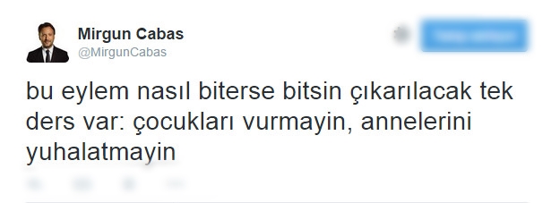 Cabas "bu eylem nasıl biterse bitsin çıkarılacak tek ders var: çocukları vurmayin, annelerini yuhalatmayin" yazdı. Cabas'ın yorumuna çok sayıda tepki tweeti geldi.