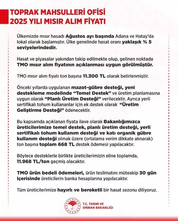 "Ülkemizde mısır hasadı Ağustos ayı başında Adana ve Hatay’da lokal olarak başlamıştır. Ülke genelinde hasat oranı yaklaşık yüzde 5 seviyelerindedir. Hasat ve piyasalar yakından takip edilmekte olup, gelinen noktada Toprak Mahsulleri Ofisi mısır alım fiyatının açıklanması uygun görülmüştür. Toprak Mahsulleri Ofisi mısır alım fiyatı ton başına 11 bin 300 lira olarak belirlenmiştir.