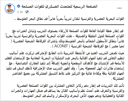 Mısır Ordu Sözcüsü General Tamir er-Rıfai'nin resmi sosyal medya hesabından yapılan açıklamaya göre, Akdeniz'de, Mısır ve Fransa'ya ait iki fırkateynin katılımıyla ortak tatbikat düzenlendi.