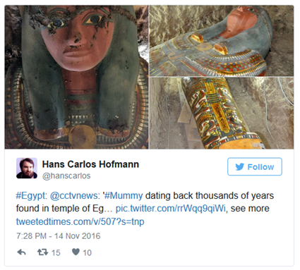 Mısır’ın El Uksur kentinde kazı çalışmaları yapan İspanyol arkeolog grubu, tahminen M.Ö. 1075-664 yıllarına ait olan bir mumya buldular. Canlı renklerle boyanmış bir tahta içerisinde bulunan mumya için bir açıklama yapan Mısır Eski Eserler Bakanlığı, mumyanın çok iyi korunduğunu ve günümüze kadar da hasar almadan ulaşabildiğini belirtti.