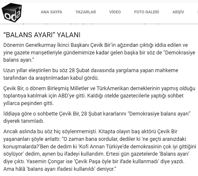 Kitaptan aktarılan bir kesitte, "Balans Ayarı" başlığı ile, "Gerekirse silah bile kullanırız." sözünün, darbeci generallerin değil, "medyanın yorumu" olduğu yalanı öne sürüldü.
