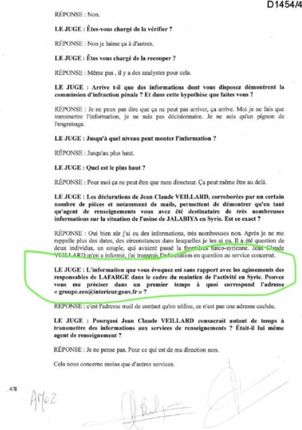İfade tutanağına göre görevli, Lafarge’ın Suriye’deki bilgi kaynakları olduğunu kabul etti.