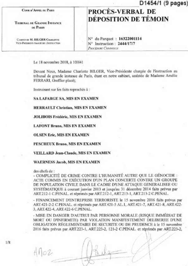 Lafarge-terör örgütü ilişkilerinin skandal olarak Fransa gündemine gelmesi ve konunun mahkemeye yansımasının ardından 18 Kasım 2018’de AM 02 kod isimli istihbarat mensubu, mahkemede ifade verdi.