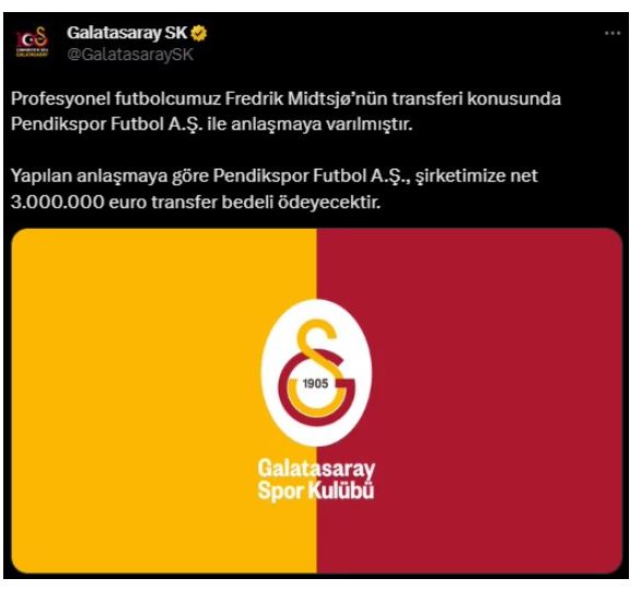 İşte Galatasaray'dan yapılan o açıklama;"Profesyonel futbolcumuz Fredrik Midtsjø'nün transferi konusunda Pendikspor Futbol A.Ş. ile anlaşmaya varılmıştır. Yapılan anlaşmaya göre Pendikspor Futbol A.Ş., şirketimize net 3.000.000 euro transfer bedeli ödeyecektir."