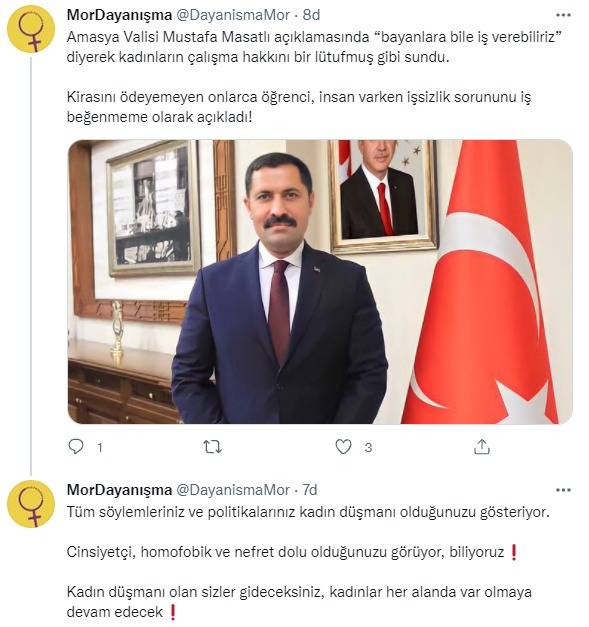 Masatlı’nın "Bayanlara bile iş verebiliriz. Küçük ölçekte, ağır olmayan, bayanların yapabileceği işler verebiliriz" ifadelerinden rahatsız olan Mor Dayanışma Derneği sosyal medya hesabından yaptığı paylaşımda, "Amasya Valisi Mustafa Masatlı açıklamasında "bayanlara bile iş verebiliriz" diyerek kadınların çalışma hakkını bir lütufmuş gibi sundu. Kirasını ödeyemeyen onlarca öğrenci, insan varken işsizlik sorununu iş beğenmeme olarak açıkladı! Tüm söylemleriniz ve politikalarınız kadın düşmanı olduğunuzu gösteriyor. Cinsiyetçi, homofobik ve nefret dolu olduğunuzu görüyor, biliyoruz! Kadın düşmanı olan sizler gideceksiniz, kadınlar her alanda var olmaya devam edecek!" ifadelerini kullandı.
