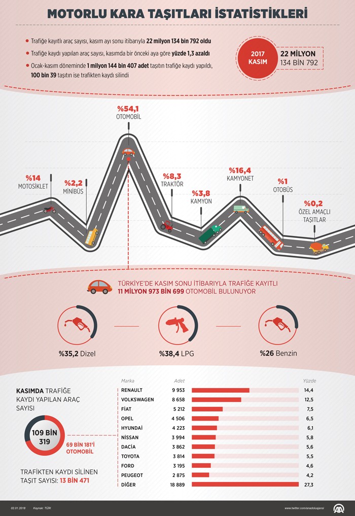 Trafiğe kayıtlı araç sayısı, kasım itibarıyla bir önceki aya göre yüzde 0,43 artarak 22 milyon 38 bin 944’ten 22 milyon 134 bin 792’ye çıktı.