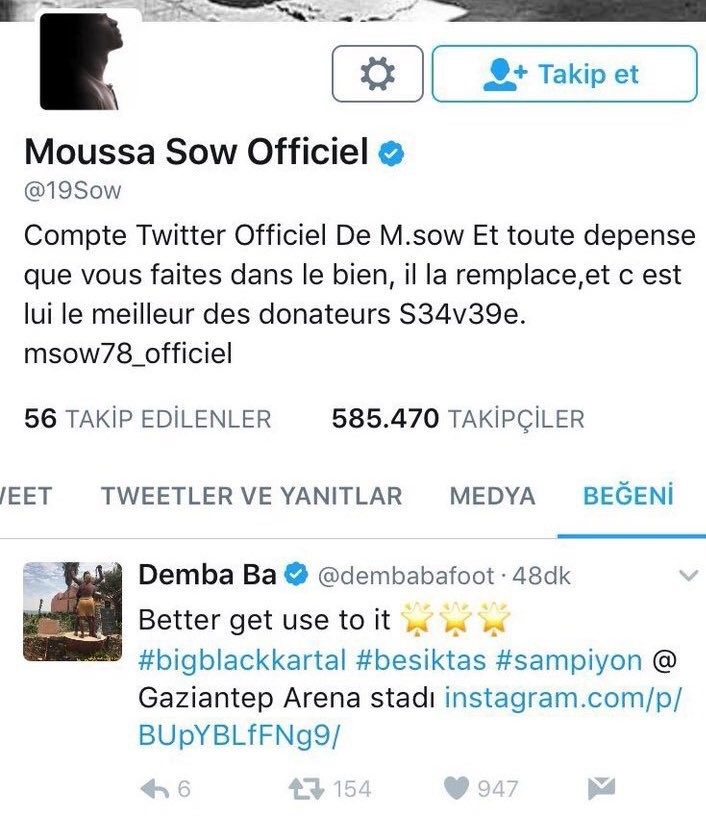 Senegalli futbolcu vatandaşı Demba Ba'nın yaptığı 3 yıldızlı paylaşım ile Caner Erkin ile Gökhan Gönül'ün şampiyonluk sonrası verdiği pozu beğendi.
