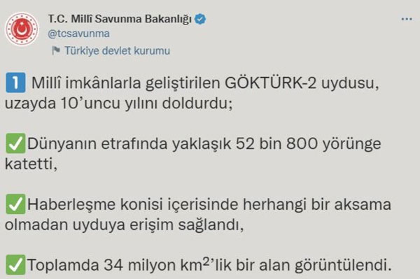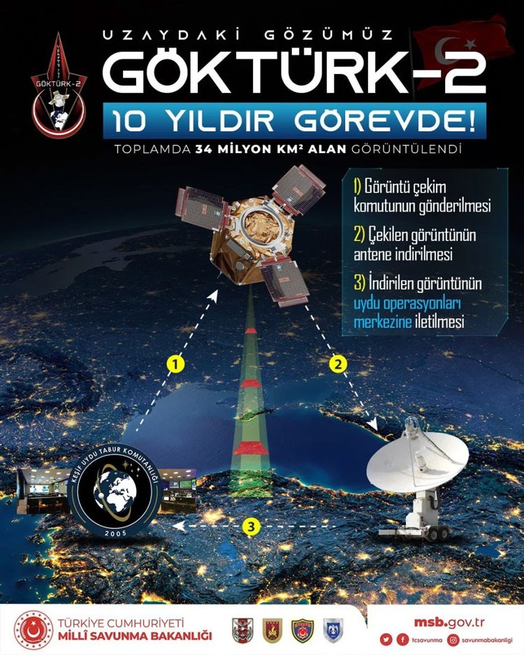 Uydu, planlanan görev ömrünü ikiye katlamayı başardı. Göktürk-2, 10 yıllık görevi boyunca dünyanın etrafında yaklaşık 52 bin 800 yörünge kat etti.