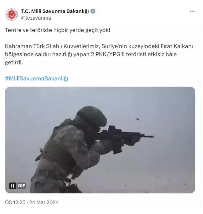 Bakanlığın sosyal medya hesabından yapılan açıklamada, "Teröre ve teröriste hiçbir yerde geçit yok! Kahraman Türk Silahlı Kuvvetlerimiz, Suriye'nin kuzeyindeki Fırat Kalkanı bölgesinde saldırı hazırlığı yapan 2 PKK/YPG'li teröristi etkisiz hale getirdi" denildi.