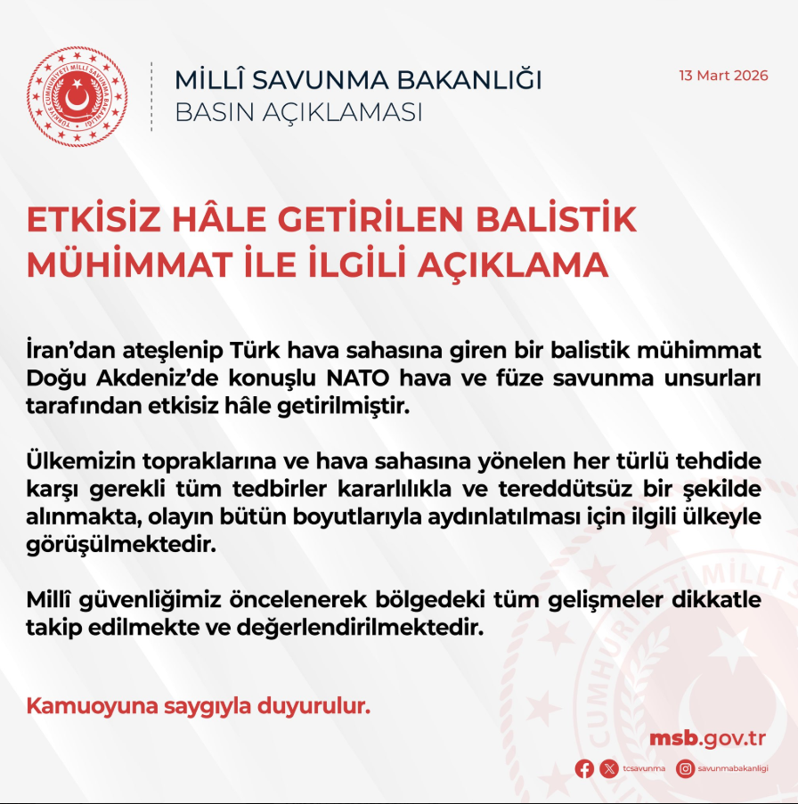 İran'dan ateşlenip Türk hava sahasına giren bir balistik mühimmat Doğu Akdeniz'de konuşlu NATO hava ve füze savunma unsurları tarafından etkisiz hale getirilmiştir.
