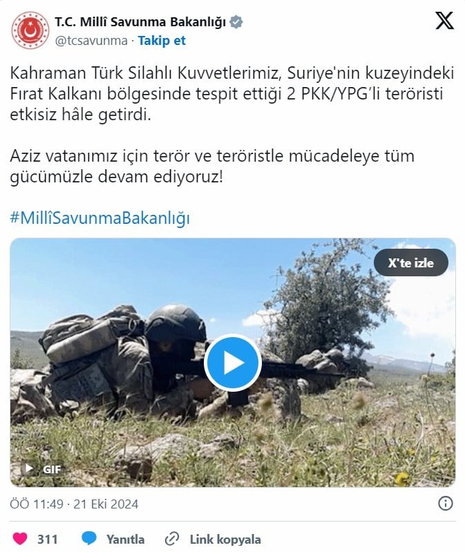 "Kahraman Türk Silahlı Kuvvetlerimiz, Suriye'nin kuzeyindeki Fırat Kalkanı bölgesinde tespit ettiği 2 PKK/YPG’li teröristi etkisiz hâle getirdi. Aziz vatanımız için terör ve teröristle mücadeleye tüm gücümüzle devam ediyoruz!"