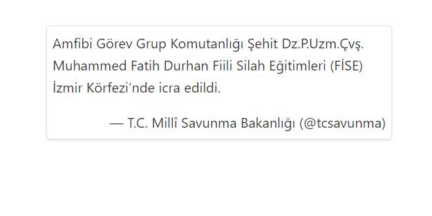 Milli Savunma Bakanlığı, Şehit Dz.P.Uzm.Çvş. Muhammed Fatih Durhan, Fiili Silah Eğitimleri’nin İzmir Körfezi’nde icra edildiğini bildirdi.
