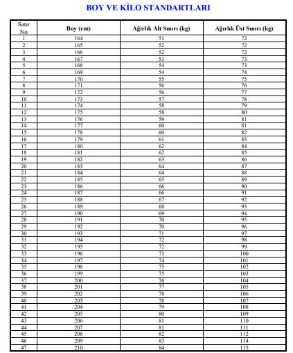 (12) Boy ve kilo standartları tablosunda (Ek-3) belirtilen değerler içerisinde bulunmak (Sözleşmeli er adaylarında ağırlık üst sınırı tablodaki üst sınırdan 10 kg fazla olabilir.),