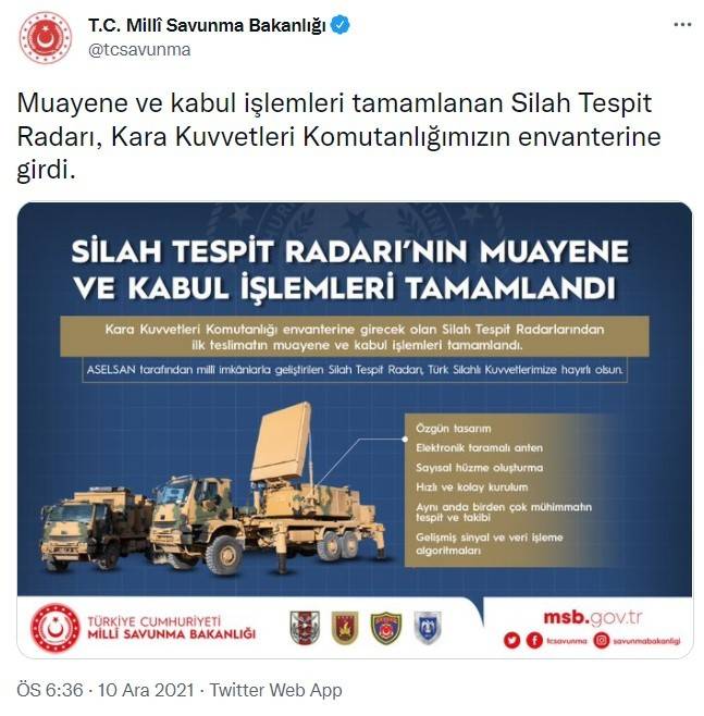 Milli Savunma Bakanlığının (MSB) sosyal paylaşım sitesi Twitter hesabından yapılan paylaşımda, “Muayene ve kabul işlemleri tamamlanan Silah Tespit Radarı, Kara Kuvvetleri Komutanlığımızın envanterine girdi” ifadelerine yer verildi.