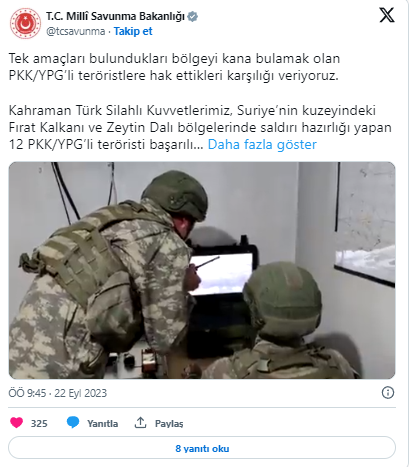 Kahraman Türk Silahlı Kuvvetlerimiz, Suriye’nin kuzeyindeki Fırat Kalkanı ve Zeytin Dalı bölgelerinde saldırı hazırlığı yapan 12 PKK/YPG’li teröristi başarılı operasyonlarla etkisiz hâle getirdi."
