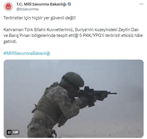 Bakanlıktan "Teröristler için hiçbir yer güvenli değil" başlığıyla yapılan açıklamada, "Kahraman Türk Silahlı Kuvvetlerimiz, Suriye'nin kuzeyindeki Zeytin Dalı ve Barış Pınarı bölgelerinde tespit ettiği 5 PKK/YPG'li teröristi etkisiz hale getirdi." ifadelerine yer verildi.