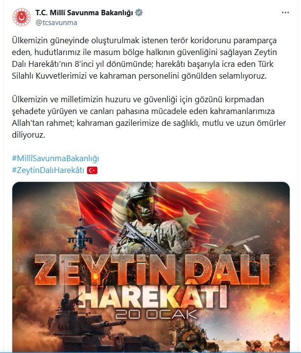 Bakanlığın sanal medya hesabından yapılan paylaşımda, "Ülkemizin güneyinde oluşturulmak istenen terör koridorunu paramparça eden, hudutlarımız ile masum bölge halkının güvenliğini sağlayan Zeytin Dalı Harekatı'nın 8'inci yıl dönümünde; harekatı başarıyla icra eden Türk Silahlı Kuvvetlerimizi ve kahraman personelini gönülden selamlıyoruz. Ülkemizin ve milletimizin huzuru ve güvenliği için gözünü kırpmadan şehadete yürüyen ve canları pahasına mücadele eden kahramanlarımıza Allah'tan rahmet; kahraman gazilerimize de sağlıklı, mutlu ve uzun ömürler diliyoruz" ifadelerine yer verildi.