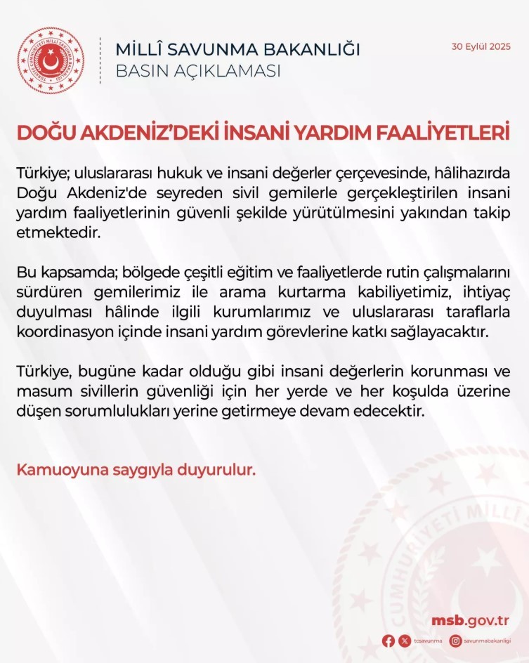 "Türkiye; uluslararası hukuk ve insani değerler çerçevesinde, halihazırda Doğu Akdeniz'de seyreden sivil gemilerle gerçekleştirilen insani yardım faaliyetlerinin güvenli şekilde yürütülmesini yakından takip etmektedir. Bu kapsamda; bölgede çeşitli eğitim ve faaliyetlerde rutin çalışmalarını sürdüren gemilerimiz ile arama kurtarma kabiliyetimiz, ihtiyaç duyulması halinde ilgili kurumlarımız ve uluslararası taraflarla koordinasyon içinde insani yardım görevlerine katkı sağlayacaktır."