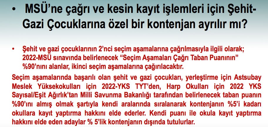 Şehit ve gazi çocuklarının 2’nci seçim aşamalarına çağrılmasıyla ilgili olarak; 2022-MSÜ sınavında belirlenecek “Seçim Aşamaları Çağrı Taban Puanının” %90’nını alanlar, ikinci seçim aşamalarına çağırılacaktır. Aday çağrı sayıları kontenjan miktarına göre belirlenecektir.