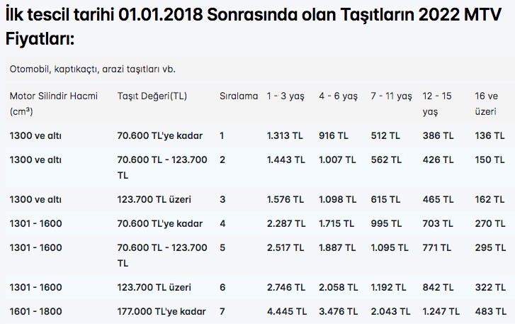 İlk tescil tarihi 01.01.2018 Öncesinde olan Taşıtların 2022 MTV Fiyatları: