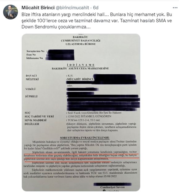 Sosyal medya üzerinden AK Parti MKYK Üyesi Mücahit Birinci’nin paylaşımlarının yorum kısmından hakaret eden kişiler iş ciddiye binip ifade vermeye gittiklerinde sosyal medya hesabım çalındı yalanına sığınmaya başladı. Birinci böyle yüzlerce dava olduğunu ifade ederek soruşturma açılan kişilerden gelecek olan tazminatları SMA ve Down Sendromlu çocuklara bağışlayacağını duyurdu.