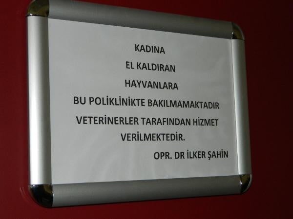 Mudanya Devlet Hastanesi'nde görvli Dr. Şahin, poliklinikteki odasının kapısına, 'Kadına el kaldıran hayvanlara bu poliklinikte bakılmamaktadır. Veterinerler tarafından hizmet verilmektedir' yazısını astı.
