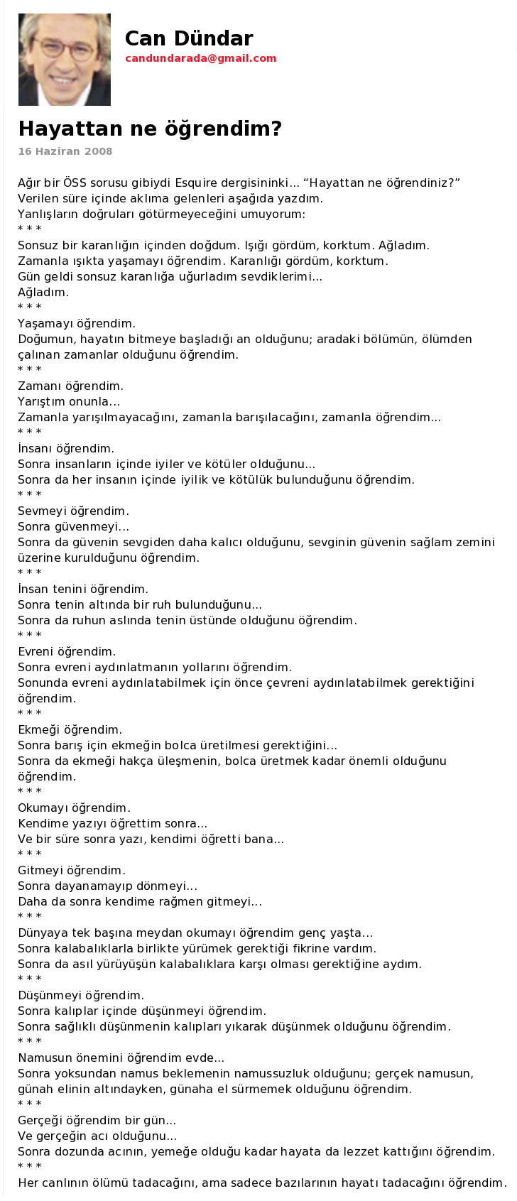 Gazetecilerin yazılarını irdeleyen malumatfurus.org'daki habere göre, Aydemir’in paylaştığı söz, Mevlana hazretlerinin değil, firari vatan haini Can Dündar’a ait çıktı. Dündar’ın söz konusu sözleri, bir köşe yazısında yayınladığı belirlendi. İşte Can Dündar'ın yazısı:
