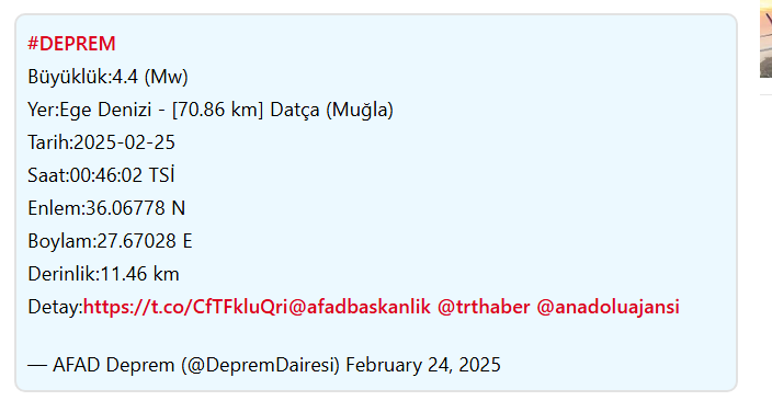 AFAD'dan alınan bilgilere göre Muğla Datça açıklarında 4,4 büyüklüğünde deprem meydana geldi.