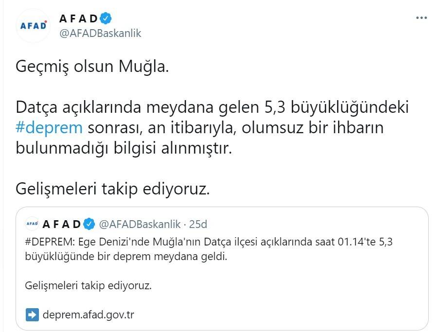 Datça açıklarında meydana gelen 5,3 büyüklüğündeki #deprem sonrası, an itibarıyla, olumsuz bir ihbarın bulunmadığı bilgisi alınmıştır.