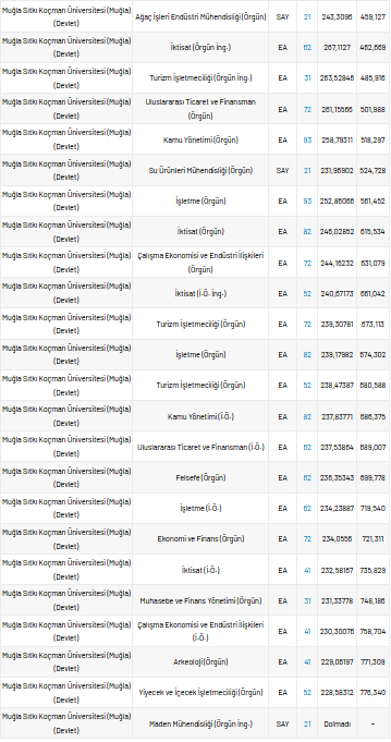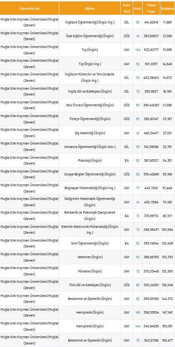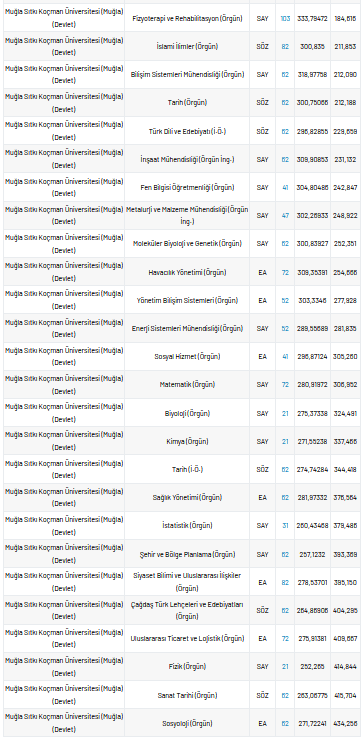 Muğla Sıtkı Koçman Üniversitesi 2021 taban puanları ve yüzdelik dilimleri