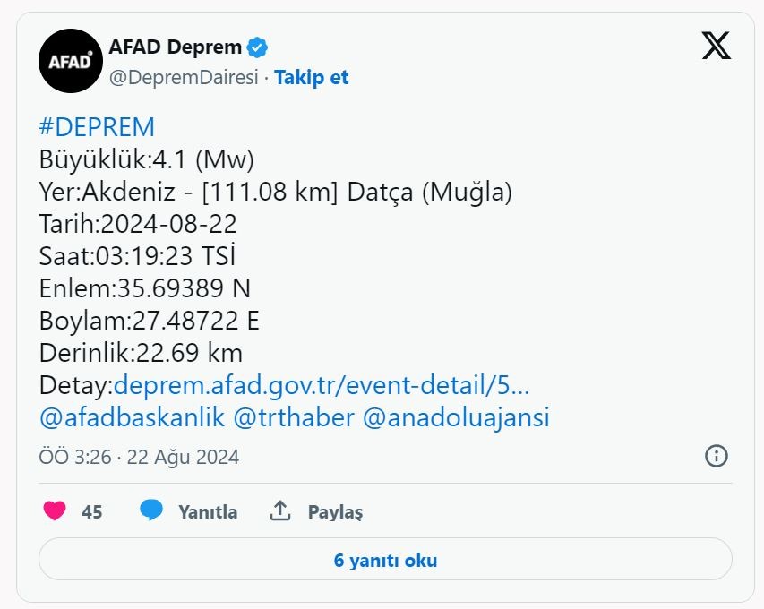 Muğla Datça açıklarında denizde 4.1 büyüklüğünde korkutan bir deprem meydana geldi.