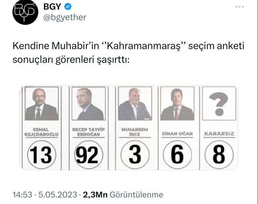 Muhalefetin siyasete alet ettiği Kahramanmaraş merkezli deprem bölgesinde CHP'ye yakın Kendine Muhabir adlı sosyal medya kanalında yapılan anket sonucu, Millet İttifakı destekçilerini şoke etti.