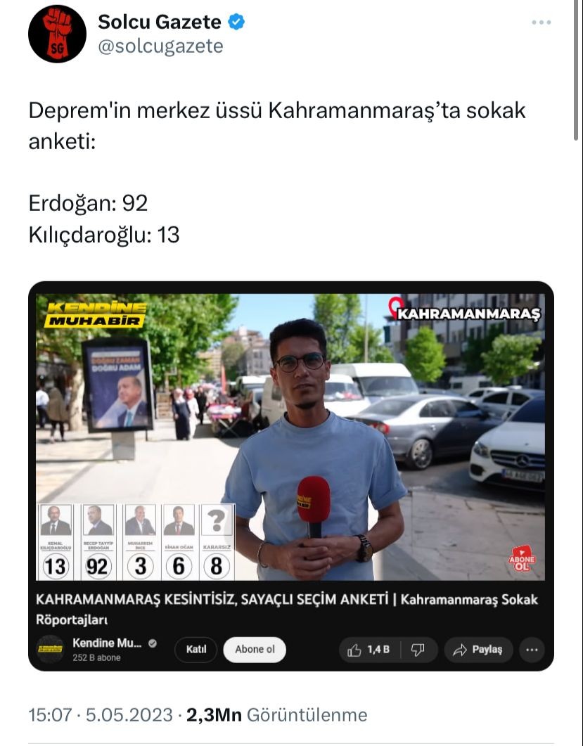 Kendine Muhabir adlı Youtube kanalında muhabir, sokak röportajında rastgele seçtiği vatandaşlara Cumhurbaşkanlığı seçiminde kime oy vereceklerini sordu.