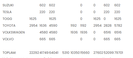 Togg'un teslimatları ocak ayı için 1625 olarak gerçekleşirken, Tesla'nın satışları ise 220'de kaldı.