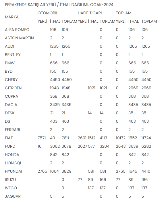 Türkiye otomobil ve hafif ticari araç pazarında bu yılın ocak ayında en fazla satışı gerçekleştirilen markalar Fiat, Renault ve Volkswagen olarak sıralandı. Ayrıca Ocak ayında 1625 Togg, 220 Tesla, 403 DS, 78 Porsche, 14 Lexus, 12 Maserati, 5 Jaguar, 2'şer Lamborghini, Ferrari ve Aston Martin ile 1 Bentley satıldı.