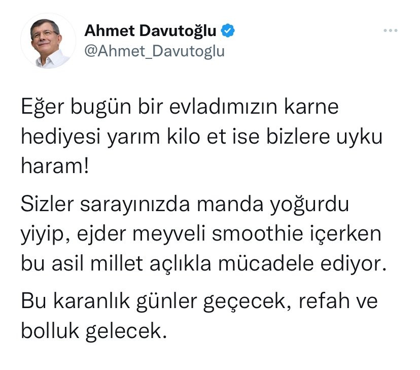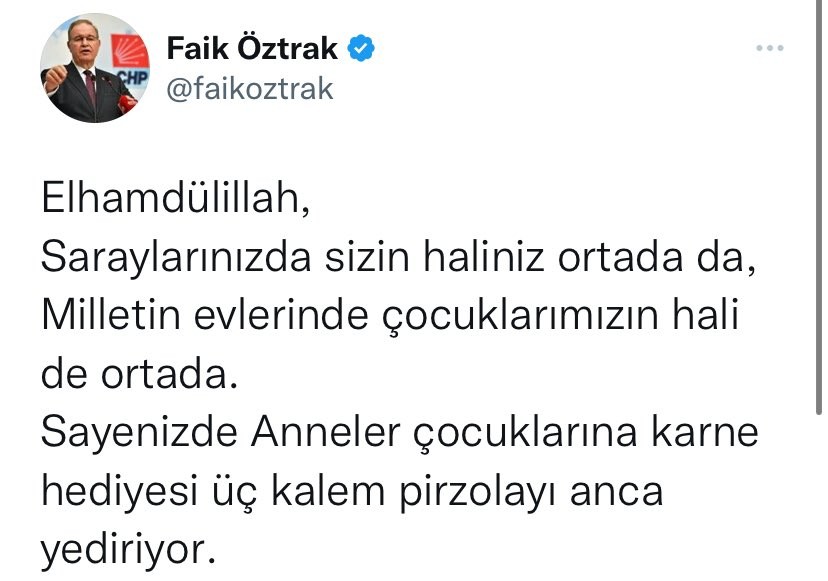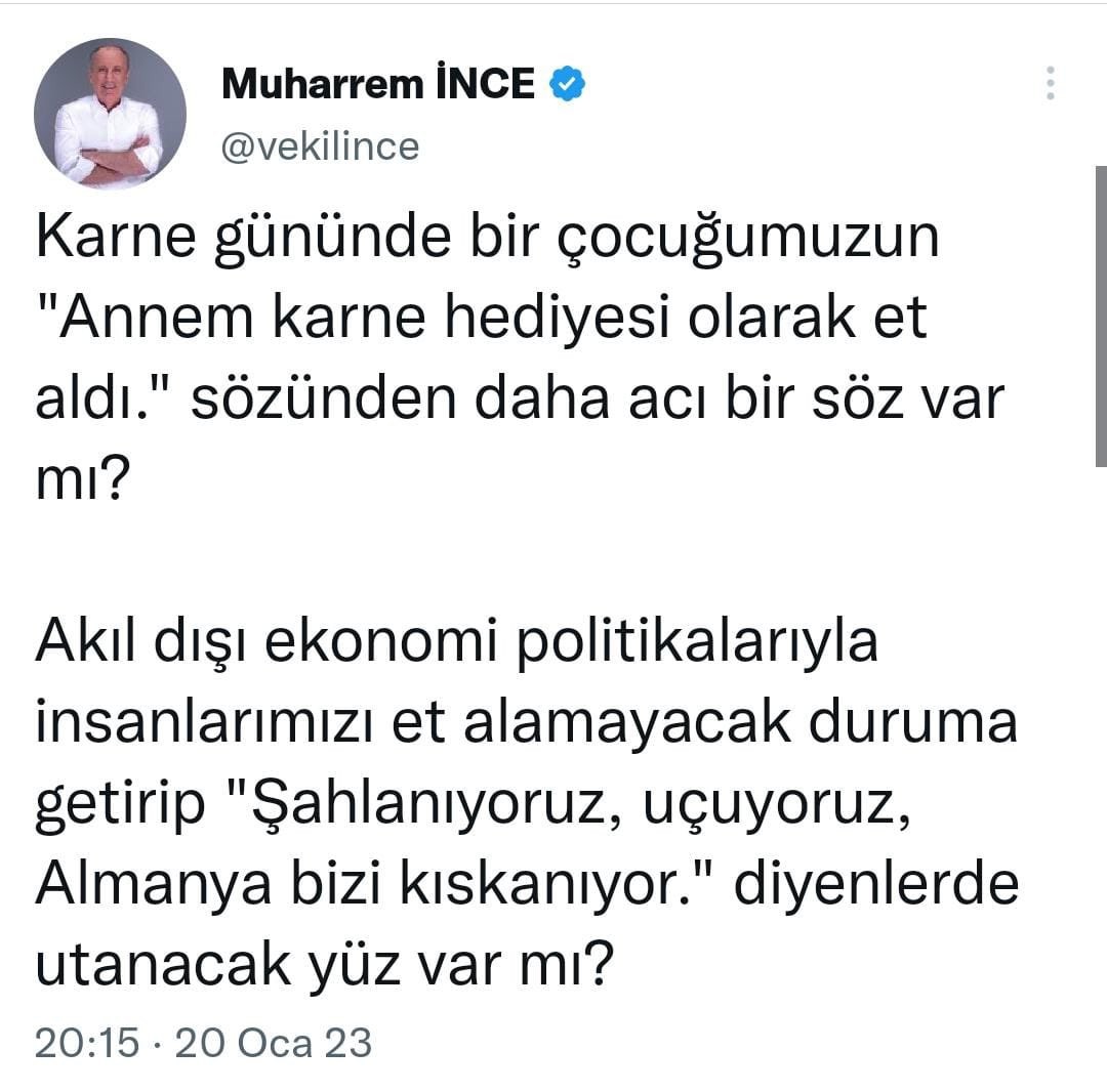 "Karne gününde bir çocuğumuzun 'annem karne hediyesi olarak et aldı' sözünden daha acı bir söz var mı? Akıl dışı ekonomik politikalarıyla insanlarımızı et alamayacak duruma getirip 'şahlanıyoruz, uçuyoruz, Almanya bizi kıskanıyor' diyenlerde utanacak yüz var mı?"