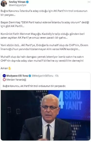 Yanardağ'ın Kavuncu için "AK Parti’nin troll ordusunun bir parçasıdır" dediği paylaşımı etiketleyen Yılman, "AK Parti’ye, Erdoğan’a muhalif olup da CHP’nin, Ekrem İmamoğlu’nun yanında hizalanmayan kim varsa HAİN kardeşim. Muhalif olup da hain damgası yemek istemiyor iseniz sakın ha sakın CHP’nin dışında aday olan muhalif birilerine oy verebilirim demeyin. Aman" ifadelerini kullandı.