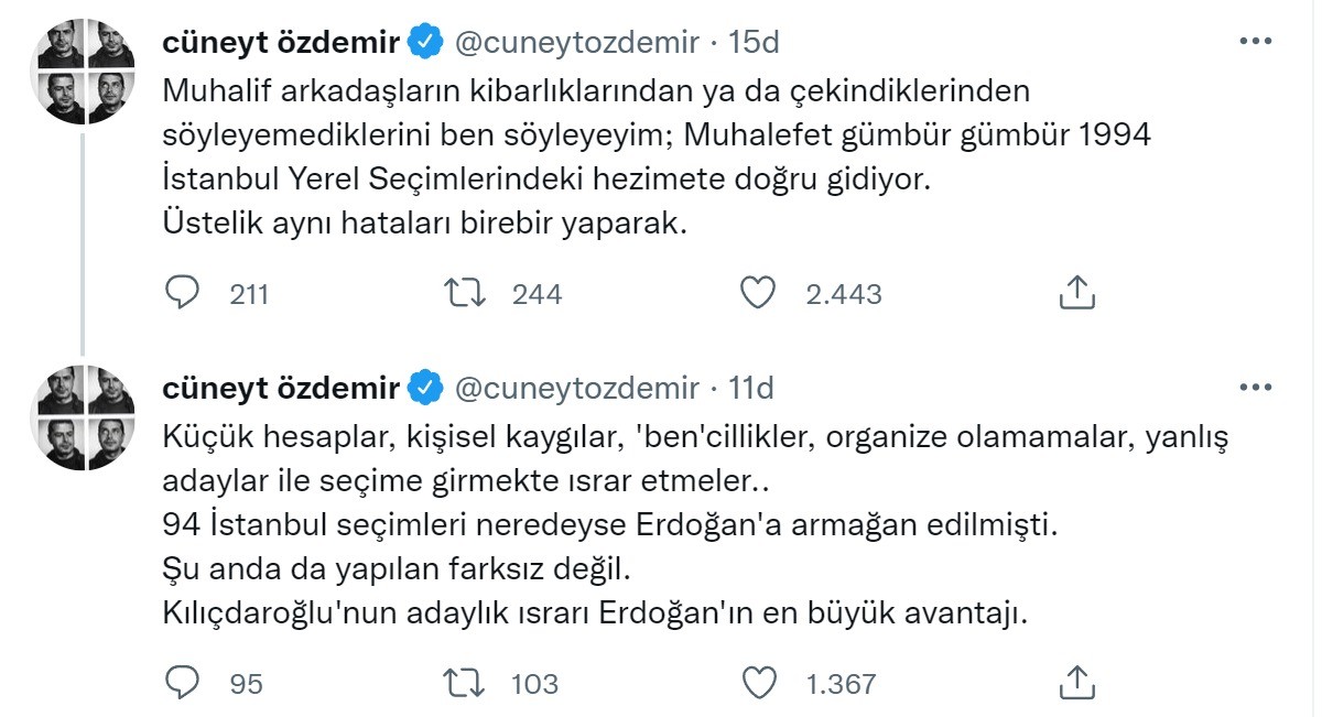"Küçük hesaplar, kişisel kaygılar, 'ben'cillikler, organize olamamalar, yanlış adaylar ile seçime girmekte ısrar etmeler... 94 İstanbul seçimleri neredeyse Erdoğan'a armağan edilmişti. Şu anda da yapılan farksız değil. Kılıçdaroğlu'nun adaylık ısrarı Erdoğan'ın en büyük avantajı. Tıpkı 94 İstanbul yerel seçimlerinde olduğu gibi doğru ve tek aday çıkartıldığında en az %10- %15 farkla alınabilecek bir seçim yanlış aday ısrarı nedeniyle ikinci turda bir kaç puanla Erdoğan'a yine yeniden hediye edilecek gibi gözüküyor..."