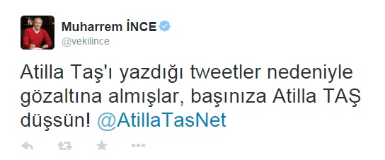 Taş'ın gözaltına alınmasının ardından CHP Yalova Milletvekili Muharrem İnce, şarkıcıya attığı twitle destek çıktı. İnce, "Atilla Taş'ı yazdığı twitler nedeniyle gözaltına almışlar, başınıza Atilla Taş düşsün" şeklinde skandal bir yoruma imza attı.