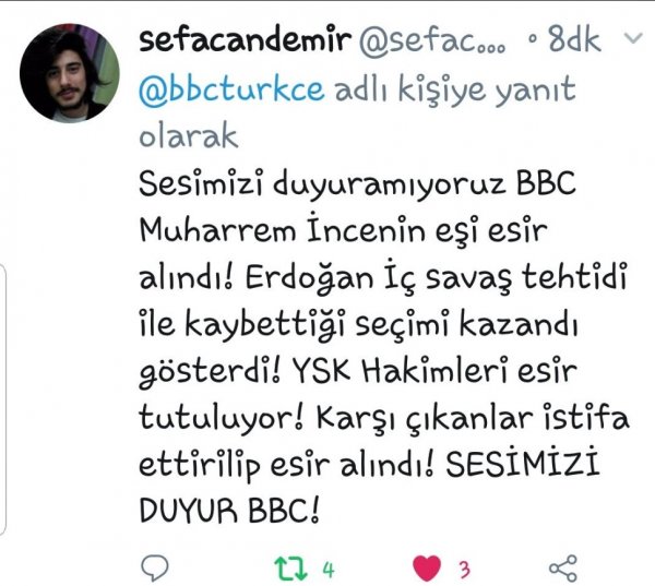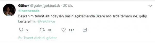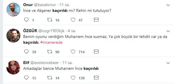 Geceden beri süren sessizliğin nedenini kesin sonuçları beklemekle açıklayan İnce, "Beni kimse tehdit etmedi, tehdit edecek adam da henüz yer yüzüne gelmedi. Yok eşimi kaçırmışlar vs. bunlar birkaç şizofrenin uydurmaları. Bunlar asparagas şeyler bunları bir kapatalım." dedi.