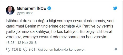 Cumhurbaşkanı Erdoğan, Muharrem İnce'nin Diyarbakır'daki mitingine katılanların neredeyse tamamının HDP'li olduğunu, bu bilgiyi de istihbarattan aldığını açıklamıştı. İnce, Twitter'dan cevap verdiği Erdoğan'a "istihbarat seni kandırmış" dedi.