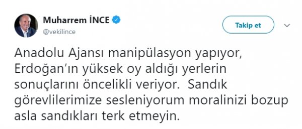 24 Haziran seçimlerinde sandıklar açılmaya devam ederken CHP'nin cumhurbaşkanı adayı Muharrem İnce'den sonuçlara ilk yorum geldi. Twitter hesabından açıklama yapan İnce, "Anadolu Ajansı manüpülasyon yapıyor. Erdoğan'ın yüksek oy aldığı yerleirn sonuçlarını öncelikli veriyor. Sandık görevlilerimize sesleniyorum. moralinizi asla sandıkları terk etmeyin." dedi